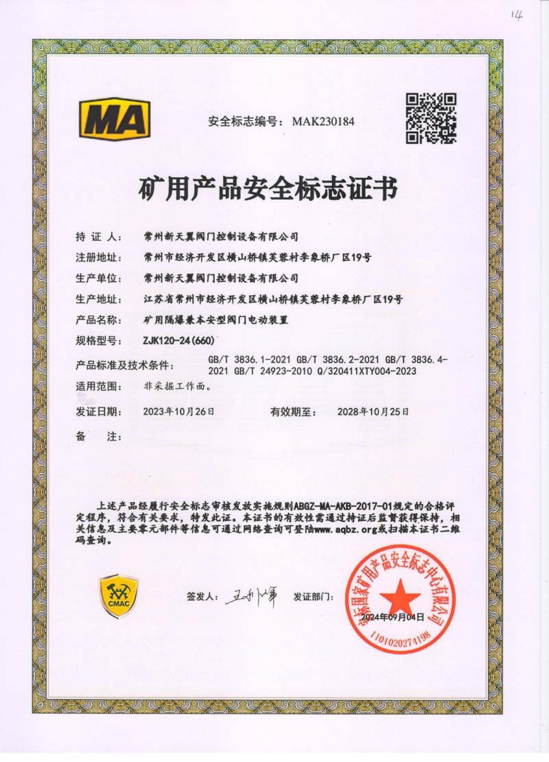 礦用產(chǎn)品安全標(biāo)志證書(shū)ZJK120-24(380)