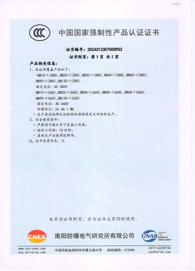 礦用隔爆QB(380V 660V) 國(guó)家強(qiáng)制性產(chǎn)品認(rèn)證證書(shū)104.1